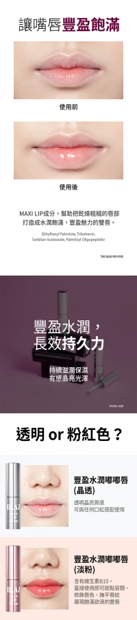 獨家專利「MAXI-LIP」複合成分精華深入修護雙唇,內含膠原蛋白、三重玻尿酸